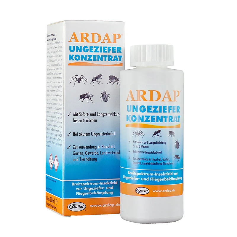 Breitspektrum-Insektizid zur Ungeziefer- und Fliegenbekämpfung. Das ARDAP Ungeziefer-Konzentrat wirkt in gebrauchsfertiger Verdünnung abtötend auf Fliegen aller Arten, Zweiflügler aller Spezies, sämtliche Milbenarten (einschließlich Grabmilben, Sarcoptes spp.), Zecken, Läuse, Flöhe, Haar- und Federlinge, sowie weitere Schädlinge oder Lästlinge, wie Schaben, Motten, Silberfischchen, Spinnen, Asseln und Ameisen in Ställen jeder Art, sowie in Wirtschaftsräumen wie Milchkammern und Dielen.