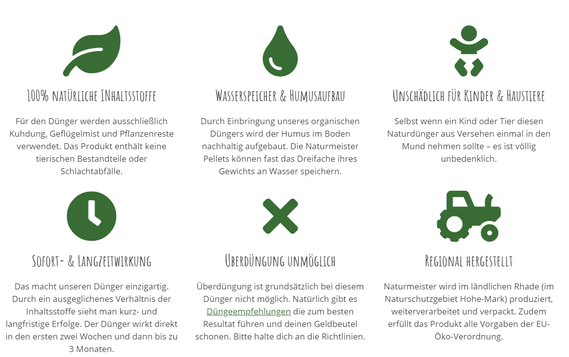 Durch Einbringung des organischen Düngers wird der Humus im Boden nachhaltig aufgebaut. Die Naturmeister Pellets können fast das Dreifache ihres Gewichts an Wasser speichern.