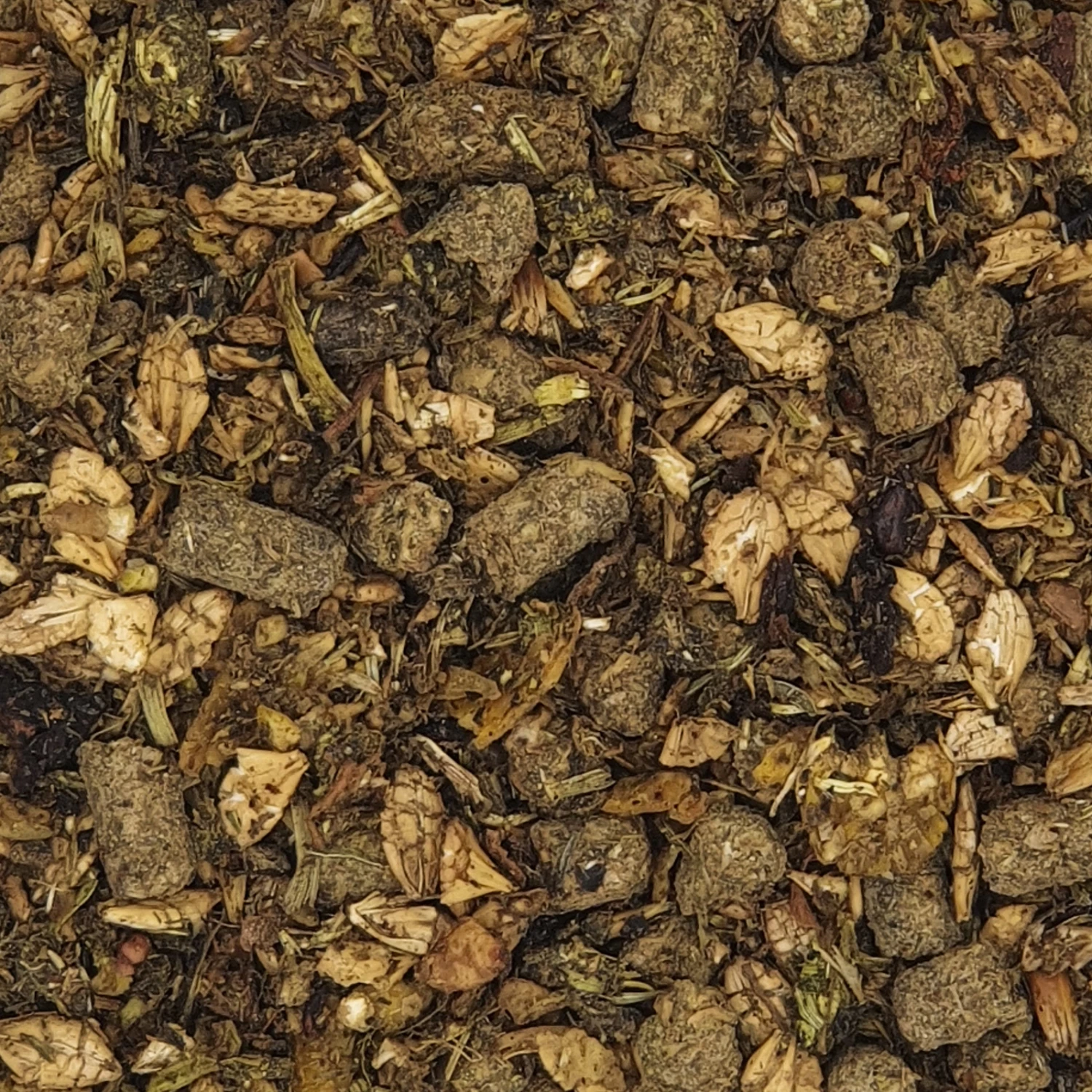 Grashäcksel warmluftgetrocknet 18 % davon 8 % Glyx-Wiese Super Fibre (Gersten-, Hafer-, Weizengras), Maisflocken, Rübenkraut